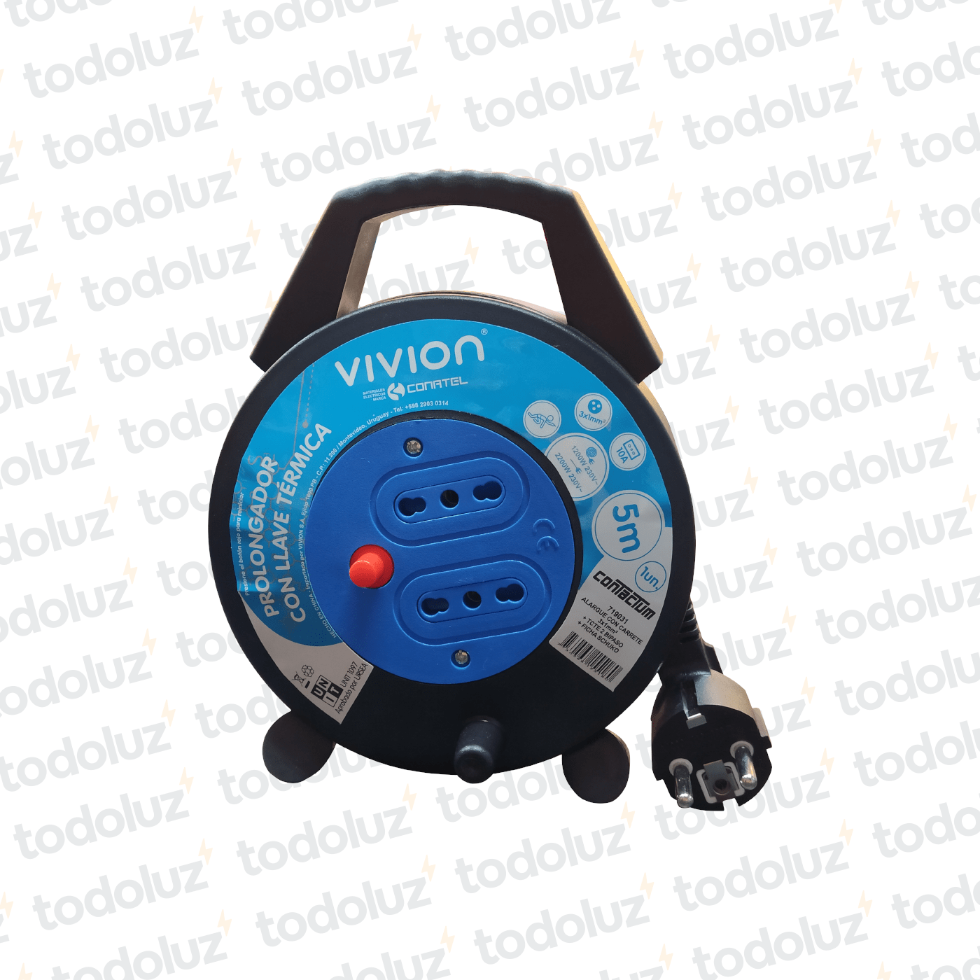 Prolongador de 2 Tomactes. c/ Llave Termica + Carretel 5mts Cable 10A 230V Conatel